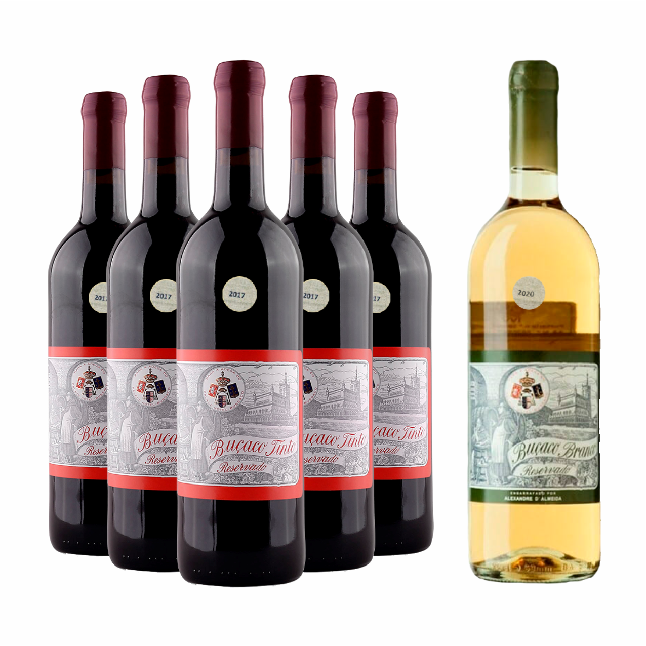 Este pack inclui 1 garrafa Buçaco Branco Reservado 2020 e 5 garrafas Buçaco Tinto Reservado 2017.